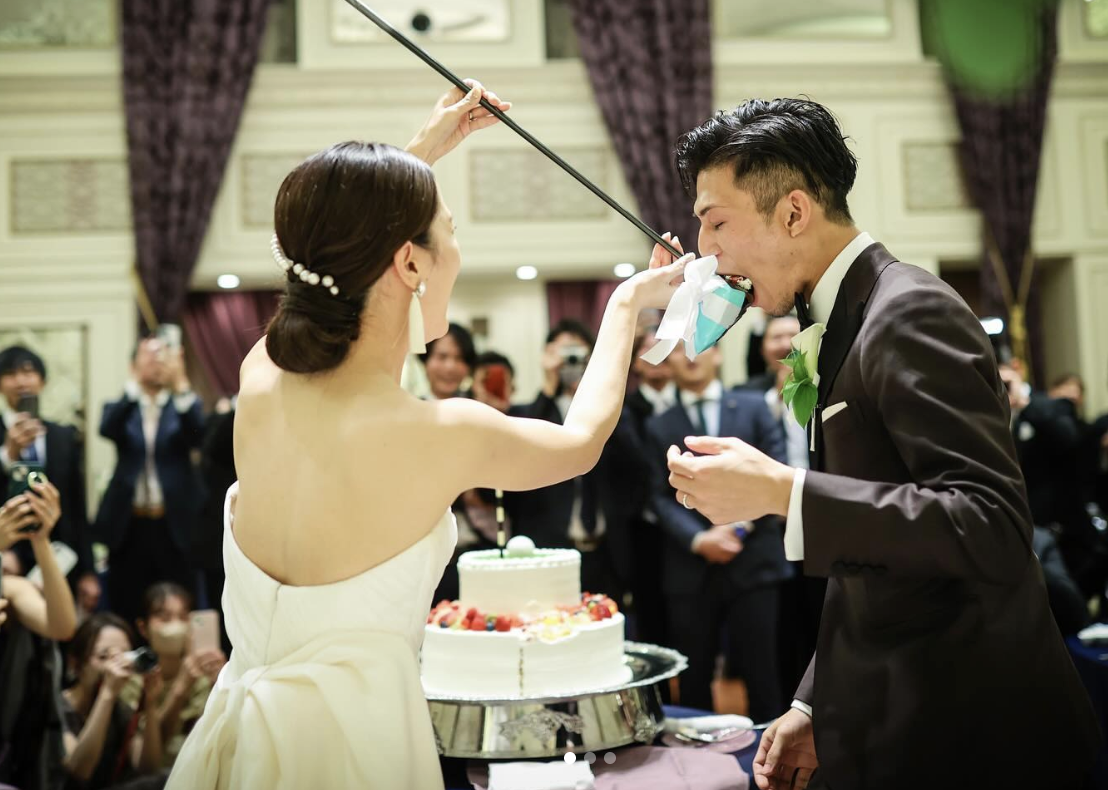ファーストバイトとは、ケーキ入刀した後に新郎新婦がお互いにケーキを食べさせあうことをいいます。