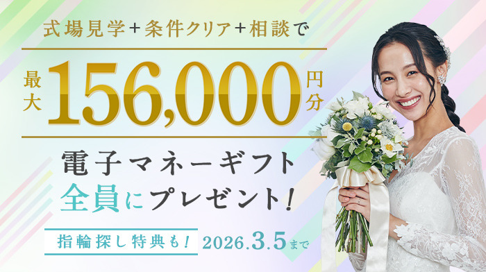 | 注意事項 | ・オンラインフェア、遠隔での式場見学は対象外となります。 ・キャンペーンの注意事項を参照してください。 |