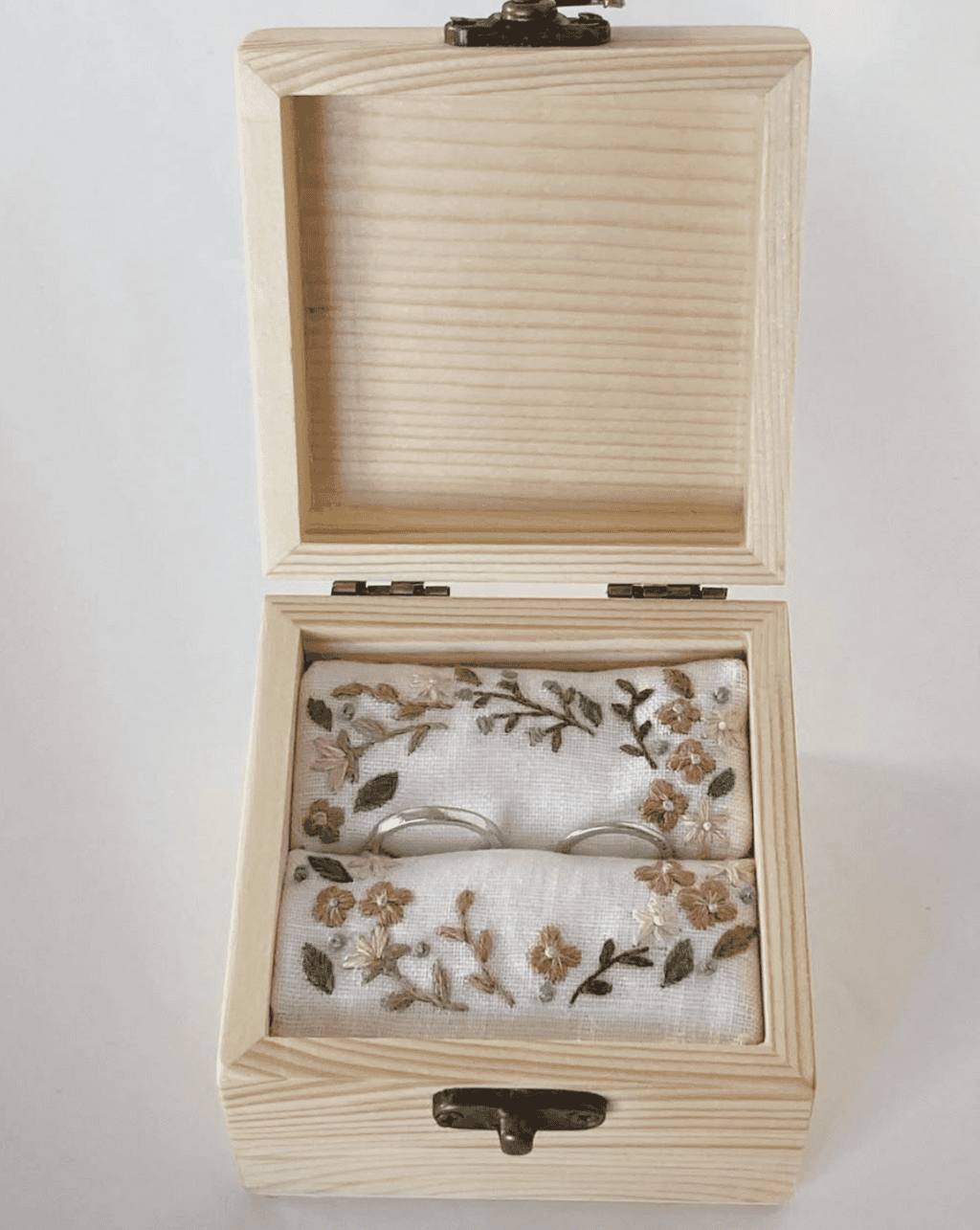 桐素材のボックスのリングピロー◎手の込んだリングピローですがキットならわかりやすい説明書をみながら簡単な裁縫と貼り付けで出来ちゃうので普段あまり裁縫をしない花嫁様には嬉しいですよね♩