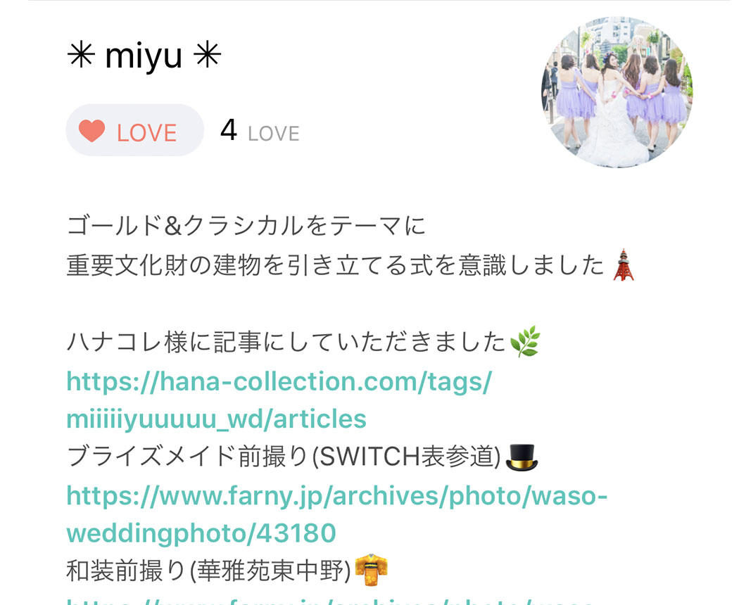 ウェディングニュースさんでのレポはまとめやすく、書きたい項目だけ選択して書いていけることや、文字数に決まりがなく、簡単に投稿できる点が良いなあと思いました。アルバム風になっている所も私自身も見る側にとっても、すごく見やすいのではないかと思っています。