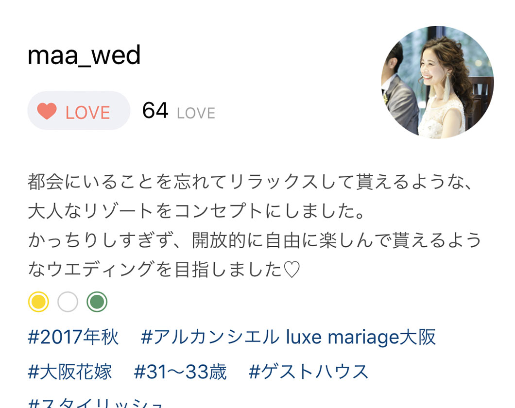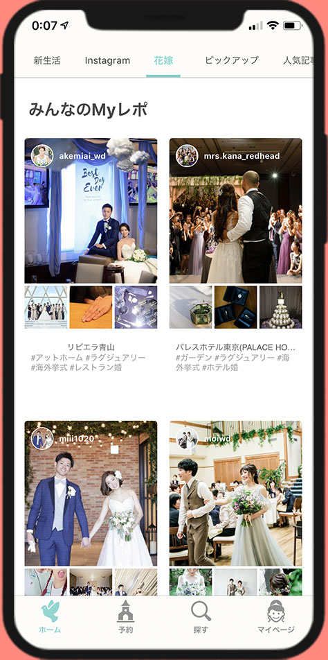 Instagramのレポは何回かに分けての更新になるので、見たい物があっても更新されるまで待つ必要があります。ウェディングニュースのマイレポだと、1人1人の花嫁さんのウェディング情報を更新を待たなくても一気に見る事ができるのがポイントだと思います。