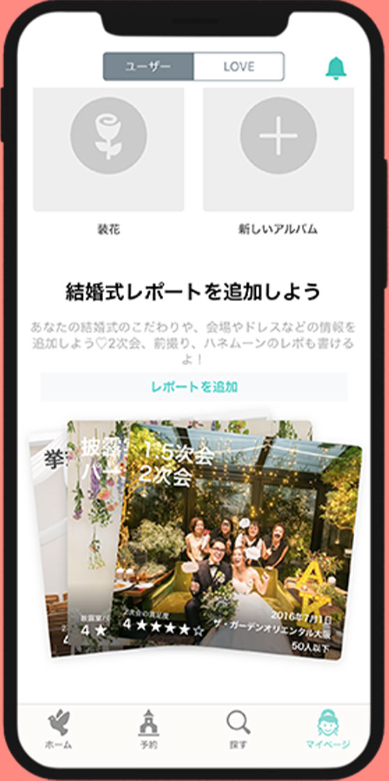 ウェディングニュースのアプリをダウンロードしたら、右下のマイページから会員登録してレポを作ってね♡