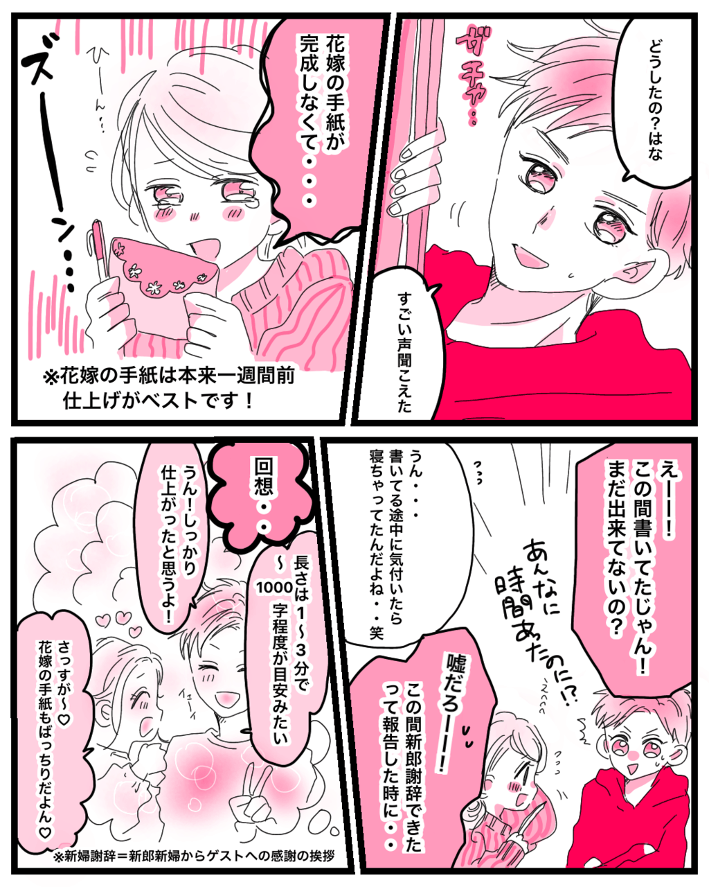 直前まで先延ばしにしてしまうと、思っていることを伝えれらなかったり、前日だと書きながら泣いてしまい当日に目が腫れてしまうことも。